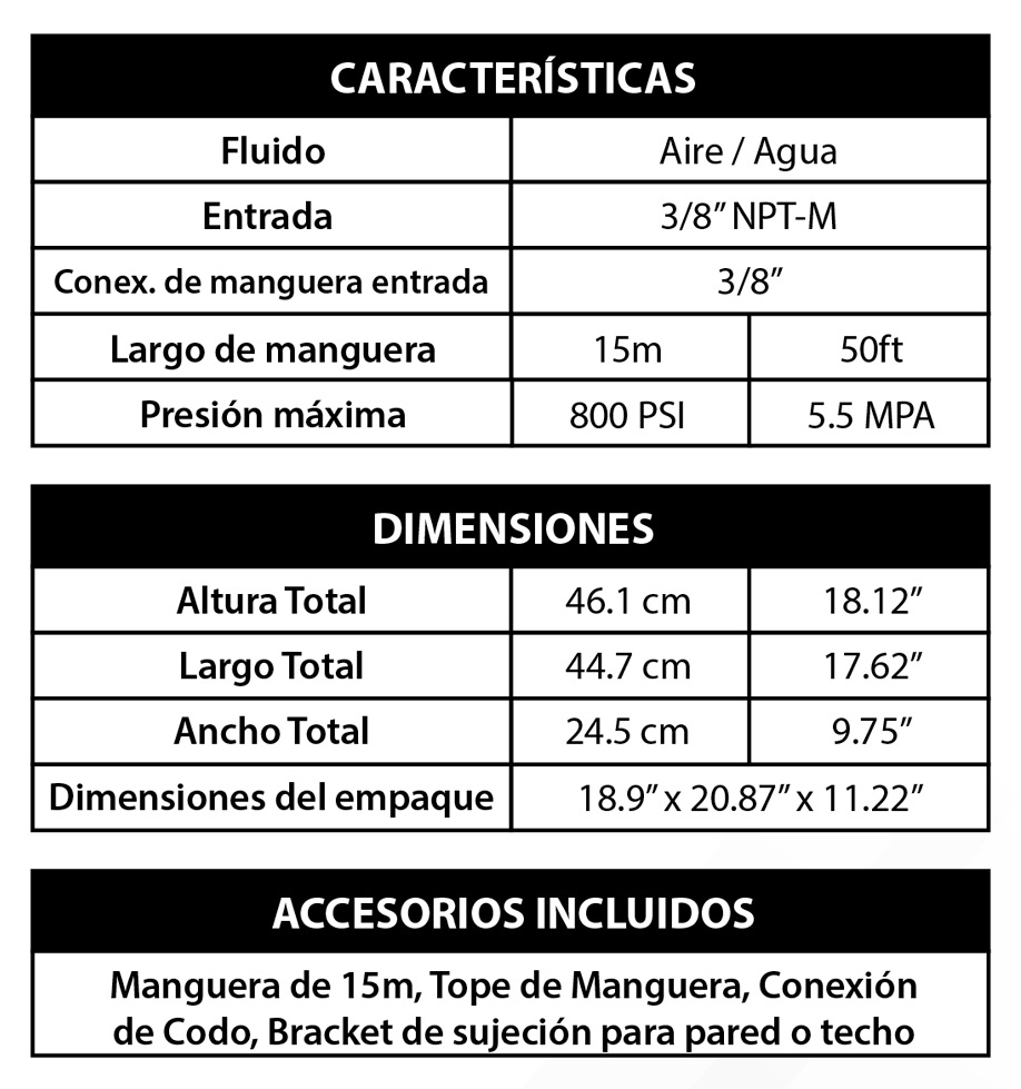 Carrete de Baja Presión Para Aire/Agua con 15m de Manguera